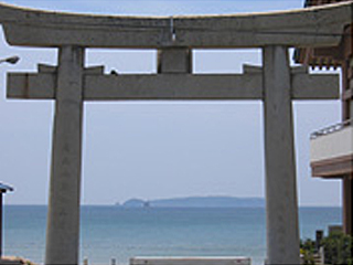 松林を越えると、海岸の鳥居が見えます。 鳥居の向こうは、宮地浜です。 玄海灘の海の向こうには、相島が霞んで見えます。 数十年前には、海の中に鳥居が建っていたそうです。